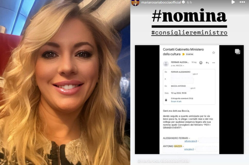 Maria Rosaria Boccia ha pubblicato nella notte nuove stories Instagram sulla questione della nomina a consigliere del ministro alla Cultura Gennaro Sangiuliano per i grandi eventi. Boccia ha diffuso il testo di una mail arrivata dal Gabinetto della Cultura il 10 luglio in cui si legge: “Gentilissima dottoressa, dando seguito a quanto anticipato per le vie brevi poco fa, le allego i contatti miei e del mio collega per qualsiasi esigenza legata alla sua nomina quale Consigliere del ministro ‘per i grandi eventi’”.