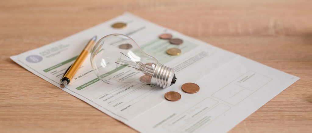 Electricity bill with light bulb, several coins and pen on the desk. Concept of electricity prices and tax payments.