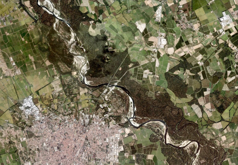 Esempio di morfologia transizionale. Fiume Ticino presso Vigevano (fonte: Ortofoto 2018-2019 Regione Lombardia)