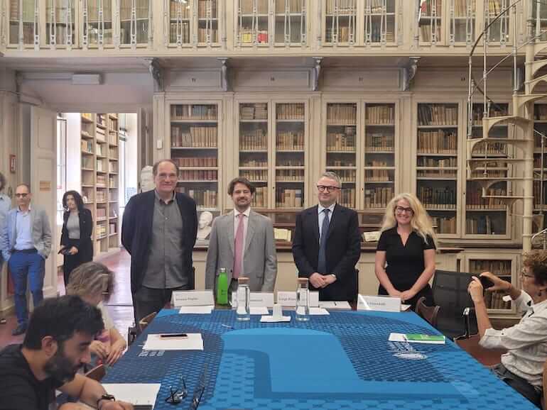 Luigi Fiorentino (Presidente del National Biodiversity Future Center), Elena Canadelli (dell’Università di Padova, Responsabile Scientifica del progetto di digitalizzazione), Stefano Cannicci (Responsabile Scientifico del NBFC per l’Università di Firenze) e Alessio Papini (referente scientifico del progetto per l’Erbario Centrale Italiano) alla presentazione del progetto. © NBFC