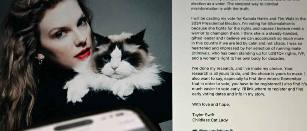Era gennaio e il candidato democratico era ancora Joe Biden. Poi, nel frattempo, sono cambiate le carte in tavola. E in questo frattempo hanno cercato in tutte le maniere, sia dall’una sia dall’altra parte, di accaparrarsi il sostegno di Taylor Swift. L’hanno tirata così tanto per la giacca che a un certo punto sembrava potesse guidare (con Michelle Obama e Oprah Winfrey) il post Biden per individuare un candidato alternativo. Fantapolitica. Ha continuato a fare la cantante. E i sostenitori di Trump invece, in maniera sguaiata e scomodando la tecnica del deep fake, hanno costruito una finta Taylor che faceva l’endorsement per il candidato repubblicano. L’endorsement è arrivato nel giorno del primo dibattito tv tra Trump e Harris, ma per Kamala.