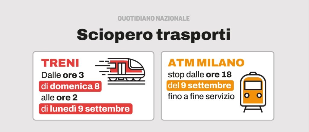“Dalle 3 di domenica 8 alle ore 2 di lunedì 9 settembre, i treni possono subire cancellazioni o variazioni per uno sciopero nazionale del personale del Gruppo FS, Trenitalia, Trenitalia Tper e Trenord.