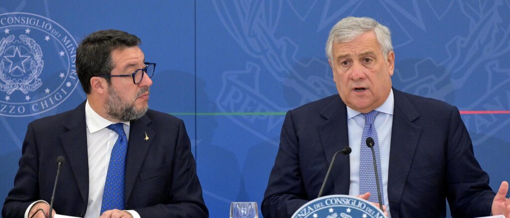 Il vice presidente del Consiglio e ministro dei Trasporti, Matteo Salvini (S), e il vice presidente del Consiglio e ministro degli Esteri Antonio Tajani durante una conferenza stampa, Roma, 16 ottobre 2023. ANSA/ETTORE FERRARI