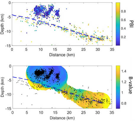Sezione del sistema di faglie dell’Alto Tiberina; la faglia principale è indicata dalla linea blu tratteggiata, quelle secondarie sono nella parte più superficiale. Sull’asse orizzontale c’è la distanza dall’inizio della sezione, su quella verticale la profondità (entrambi in kilometri). I punti sono gli ipocentri dei terremoti. In alto: eventi solitari (in giallo) e clusterizzati (in blu). In basso: zone dove c’è un percentuale più alta (in giallo) e più bassa (in blu) di eventi piccoli. Dalla figura si può apprezzare come i due aspetti siano collegati fra loro. © Communications Earth & Environmen