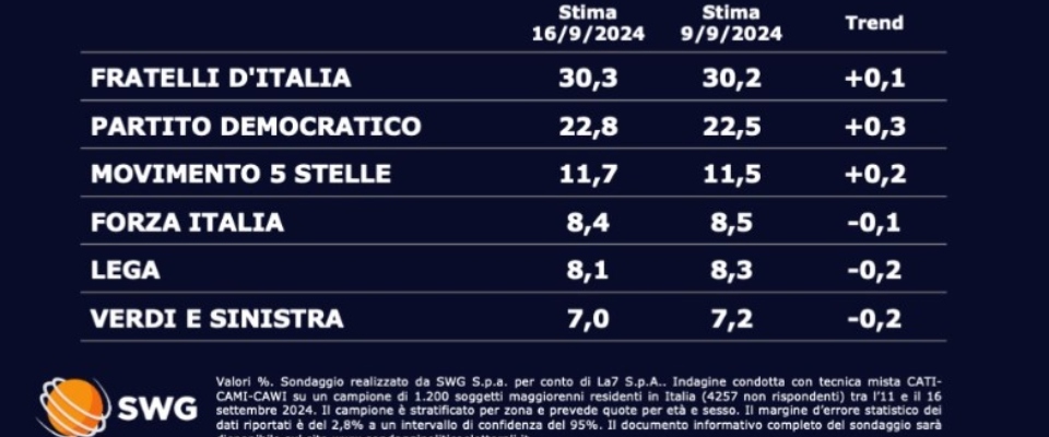 Dunque, se si votasse oggi, FdI andrebbe ancora meglio delle recenti elezioni europee. Incasserebbe secondo il sondaggio Swg il 30,3%, in crescita dello 0,1% rispetto al precedente sondaggio di una settimana fa. Dopo settimane in costante calo, il Pd di Elly Schlein recupera lo 0,3% attestandosi al 22,8 per cento. Recupera lo 0,2% il M5S fermandosi all’11,7%; sostanzialmente invariato il consenso di Forza Italia, in calo dello 0,1% all’8,4%. Quindi abbiamo la Lega, che si assesta all’8,1 per cento. Calano Verdi e Sinistra, di 0,2 punti percentuali, al 7%.