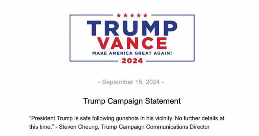 Donald Trump è al sicuro dopo che si sono verificati alcuni spari nelle sue vicinanze, presso il campo da golf a West Palm Beach, in Florida, in cui stava giocando. Lo afferma il direttore della comunicazione della campagna di Trump, Steven Cheung senza fornire dettagli. A quanto sembra non si tratta di un attentato, due persone si sono sparate tra di loro fuori dal campo da golf, senza alcuna intenzione di colpire Trump che non ha corso alcun pericolo.