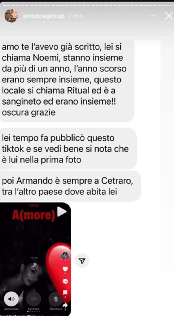 “Lei si chiama Noemi, stanno insieme da più di un anno L’anno scorso erano sempre insieme. Questo locale si chiama Ritual ed è a Sangineto, erano insieme! Lui tempo fa pubblicò questo tiktok e se vedi beni si nota che è lui nella prima foto. Poi Armando è sempre a Cetraro, paese dove abita lei”, la segnalazione pubblicata dalla blogger.